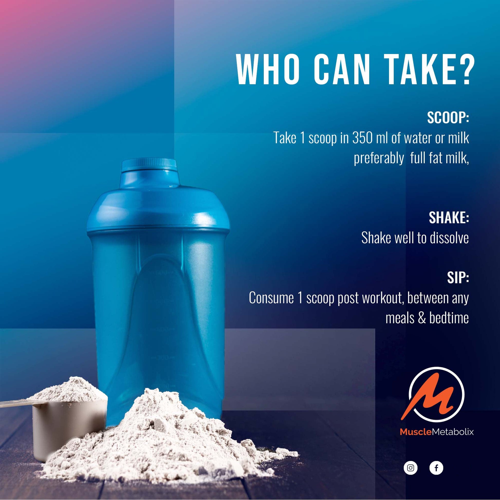 Add 1 scoop (70g) of mass gainer with 350ml of water or double toned milk into a shaker or blender and mix for few seconds until the powder dissolves completely.