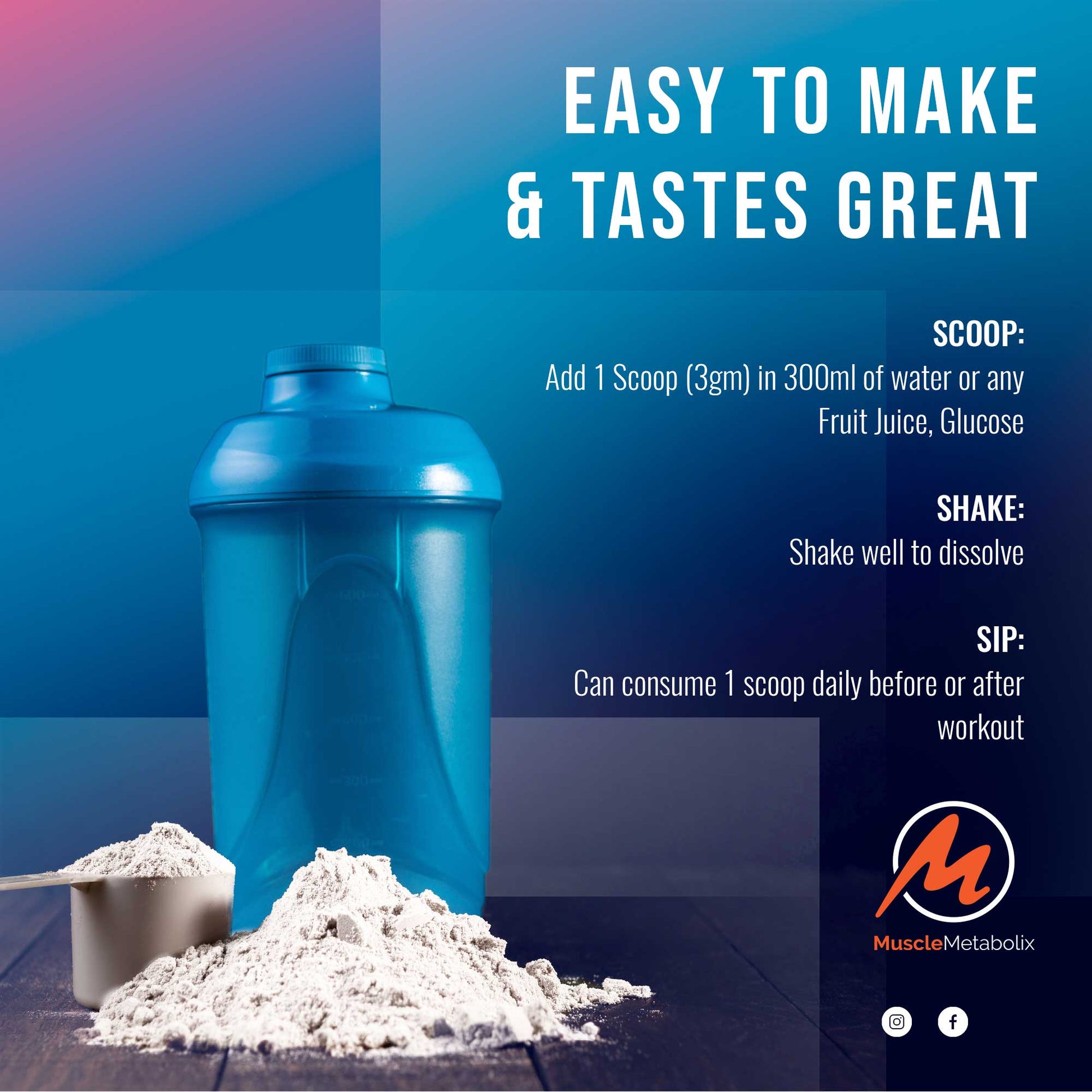 Scoop:- Add 1 Scoop (3g) in 300 ml of water or any Fruit Juice, Glucose.